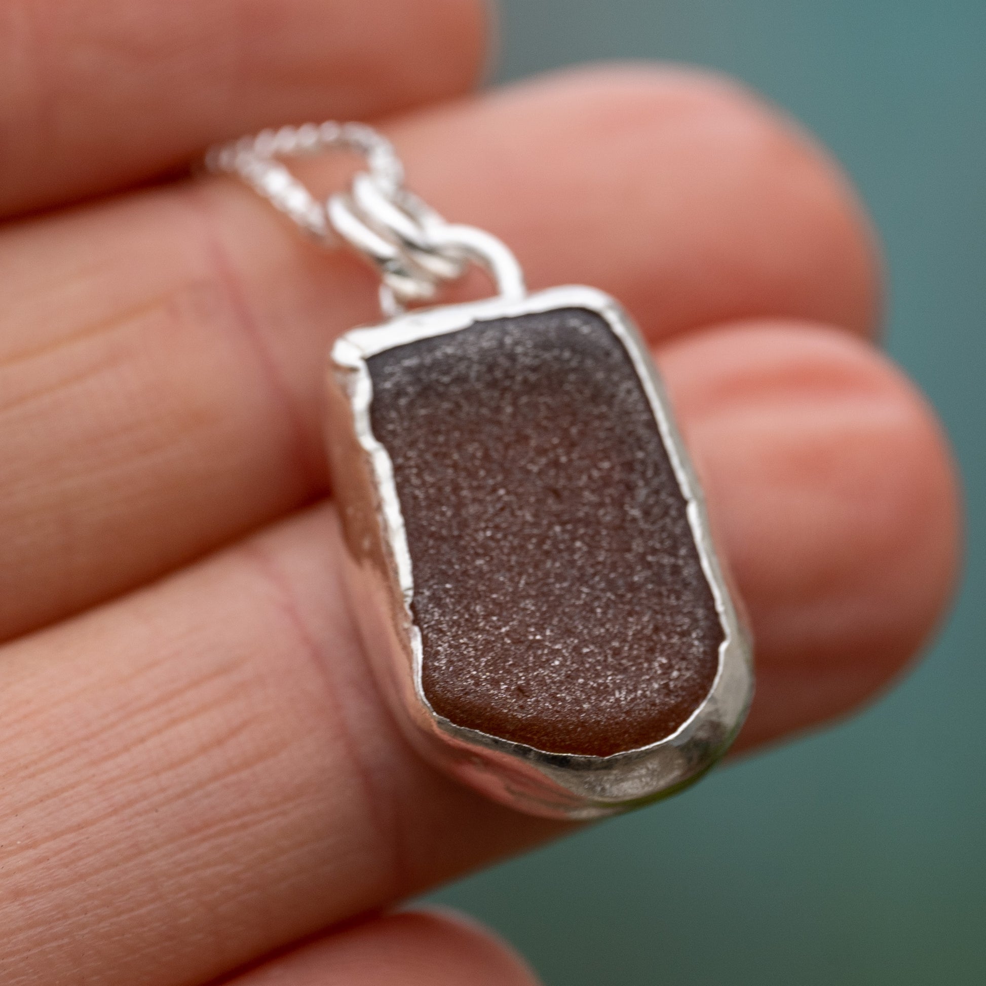 A beautiful organic shape seaglass pendant with a wave pierced into the back, handmade by myself!