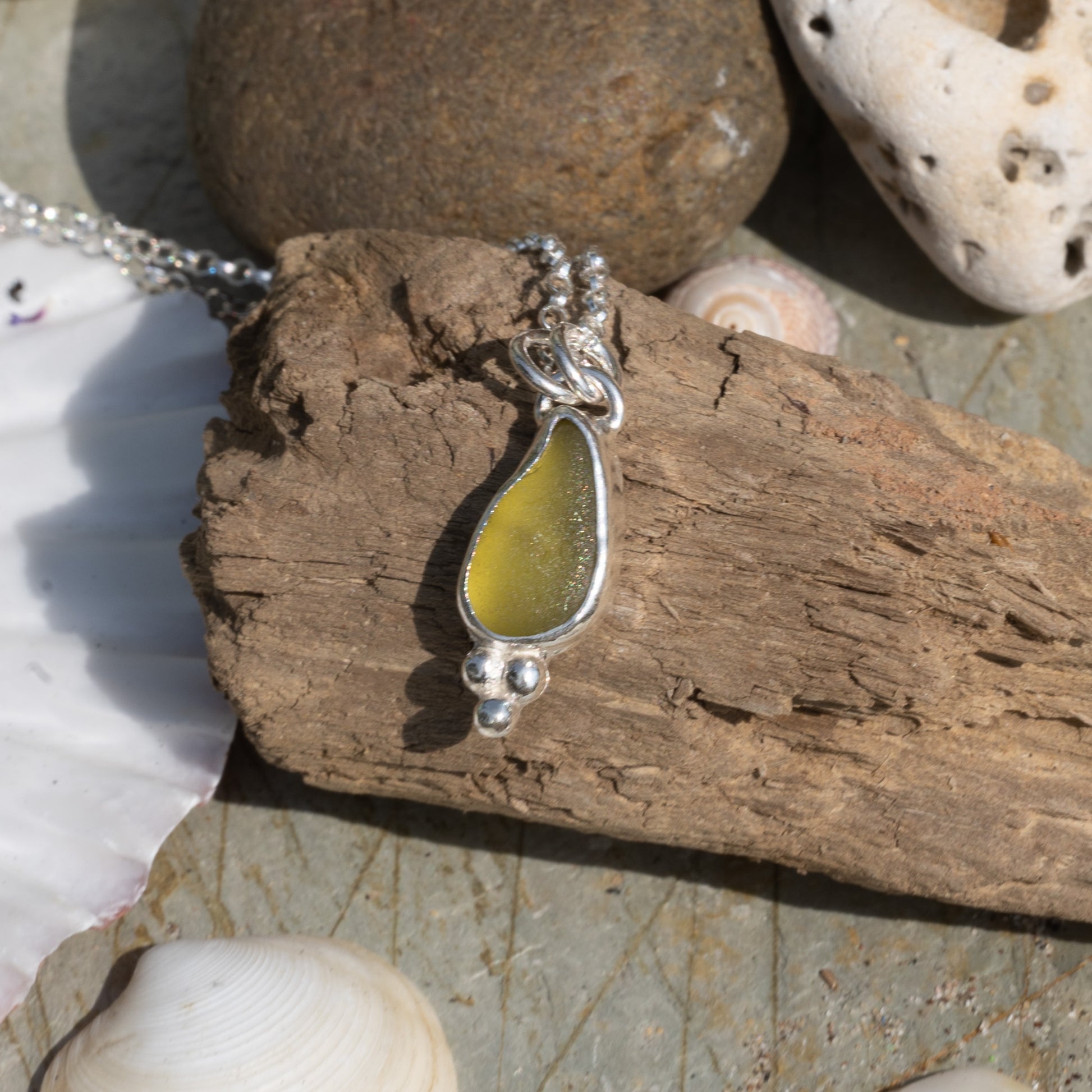 A beautiful organic shape seaglass pendant with decorative balls/granulation, handmade by myself!
